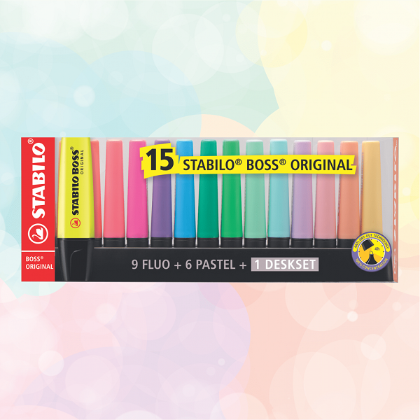 El STABILO BOSS ORIGINAL es un resaltador diferente. Sus colores le dan a su uso un look sutil y estiloso. Sus 15 colores hacen que siempre encuentres uno para tu estado de ánimo